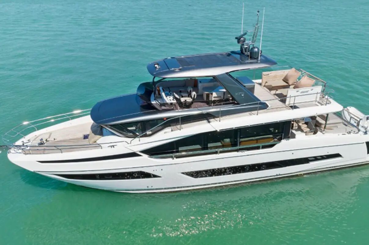 • This 63′ prestige not only has plenty of seating and room for all your guests, but also offers plenty of options for a day on the water! Enjoy the beautiful Florida sun with the retractable sunroof on the flybridge or take a swim with plenty of water toy options.
